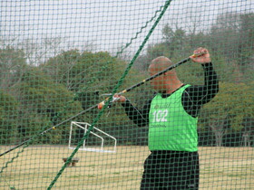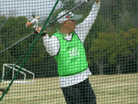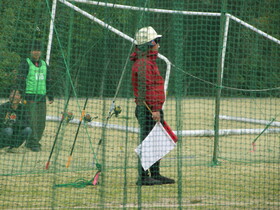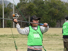 (6) 投てき行為(審判員が投てき開始の合図をしてから、オモリが着地するまでの間)中に、投てきエリアより外の地面に足を踏み出した場合、投てきラインに足が触れた場合及び前方の地面に竿先・オモリが触れた場合はファウルとする。