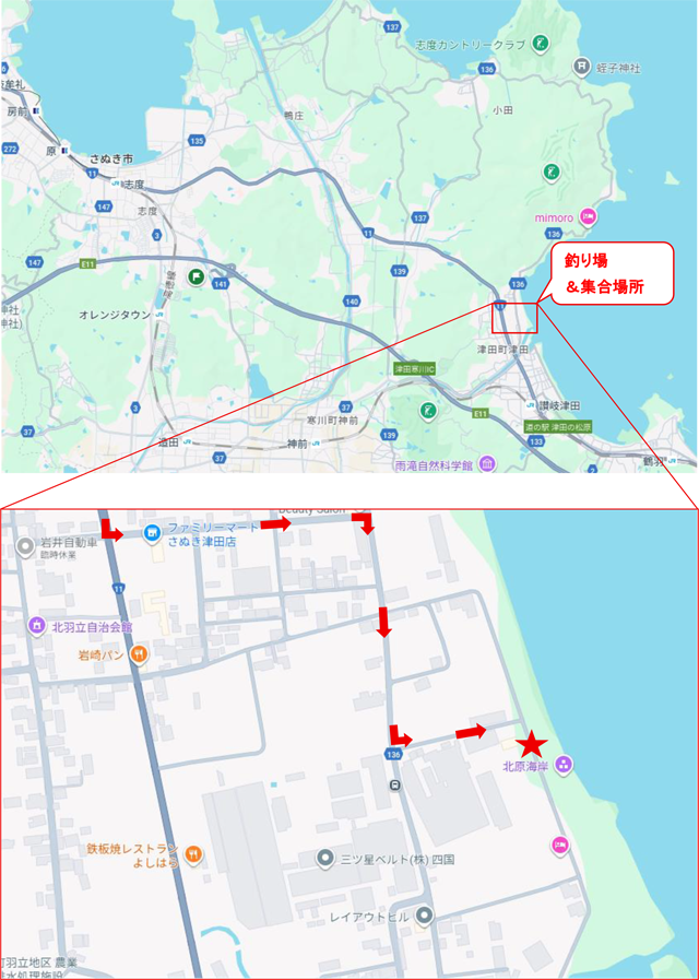 釣り場(砂浜)の海岸道路に集合、審査も同場所 ※裏(2ページめ)の地図を参考にしてください |